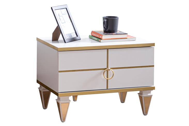 Komodin üzerinde CNC işleme ve altın varak renginde boya vardır.