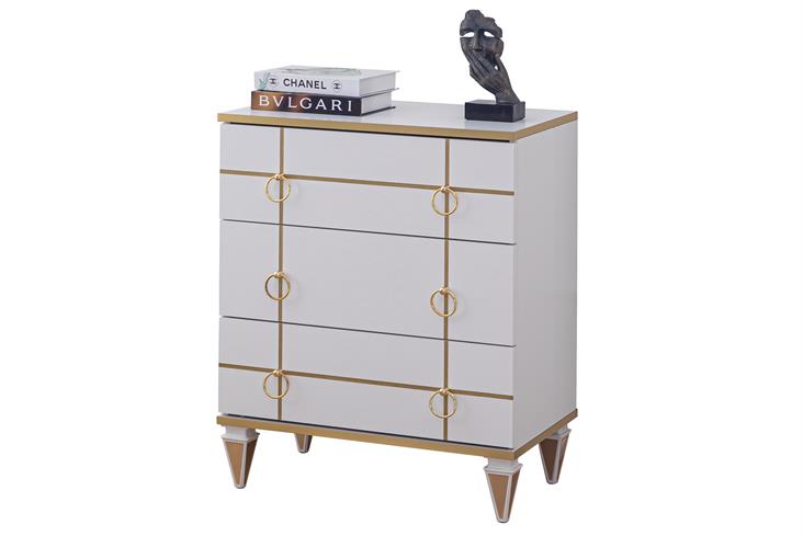 Şifonyer üzerinde CNC işleme ve altın varak renginde boya vardır.